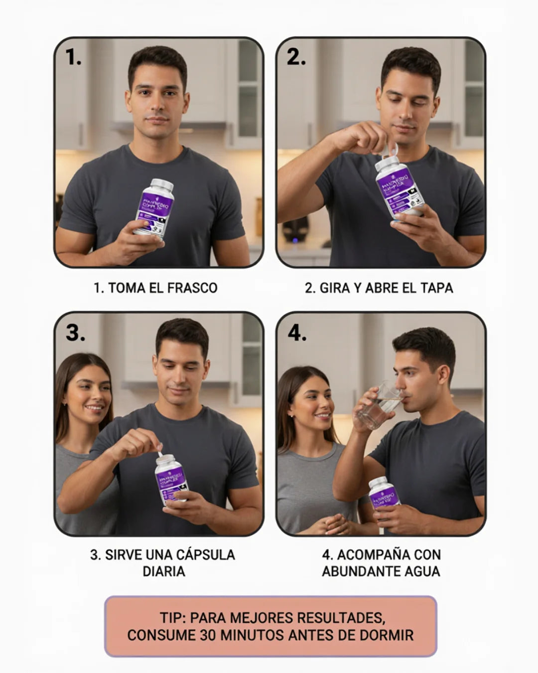 Recomendamos tomar **dos (2) cápsulas al día** con un vaso de agua. Para maximizar los beneficios de relajación y sueño, consúmelas aproximadamente **30 minutos antes de acostarte**.