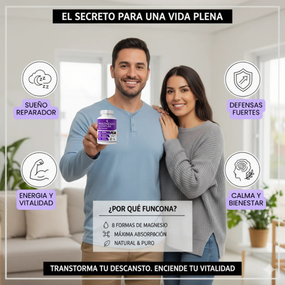 Gracias a su mezcla de 8 magnesios quelados (Glicinato, Citrato, Malato, etc.), ofrece: **Sueño Profundo**, **Alivio de Calambres**, **Reducción de Estrés** (calma nerviosa) y **Soporte de Energía**.