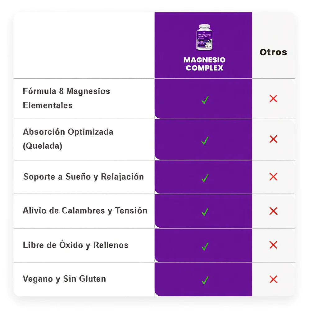 Mientras la competencia ofrece fórmulas genéricas con óxido de magnesio barato y escasa absorción, Magnesium Complex 8-en-1 garantiza una combinación exclusiva que: